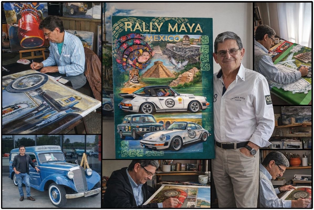 El póster Rally Maya México 2026 integra autos clásicos, sitios arqueológicos y fauna del sureste en una pieza que se ha convertido en tradición del evento. Jorge Miguel García firma por onceava ocasión la obra oficial, consolidando el vínculo entre arte y automovilismo histórico.