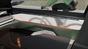 Esta tecnología crea un efecto de ventana extendida en las puertas. Además, ofrece un nuevo tipo de información avanzada de asistencia a la conducción (ADAS), es decir, que, si se detecta algún riesgo antes de abrir la puerta, se avisará a los ocupantes para que puedan reaccionar en la oscuridad o en condiciones críticas donde el ojo humano puede no ver correctamente. El Light Tile está perfectamente integrado en la zona superior del panel de la puerta y proporciona una visualización de alta calidad del entorno del vehículo, llevando la atmósfera exterior al interior. La tecnología de losetas flexibles es delgada (normalmente 3 mm) y proporciona homogeneidad de borde a borde, al tiempo que permite un sistema escalable de forma, tamaño, resolución y salida de luz. También se puede utilizar para otros fines, como iluminación ambiental dinámica de superficies. La puerta transparente utiliza cámaras eMirror existentes y un algoritmo de distorsión de imagen.