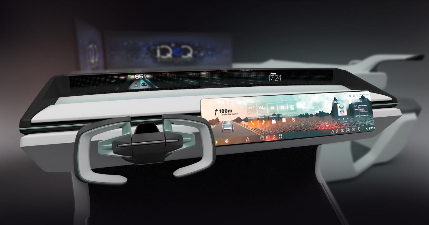 Esta innovadora pantalla de pilar a pilar se ubica en la intersección del parabrisas y el panel de instrumentos, por lo que crea una experiencia de conducción más segura al reducir la redirección de la atención del conductor desde la carretera hacia las pantallas, las cuales convencionalmente están debajo de su campo de visión. Así, las pantallas de alta resolución y la HMI aparecen solo cuando es necesario, lo que reduce la carga cognitiva y mejora la seguridad. Además, su contenido gráfico está impulsado por los mismos componentes electrónicos, lo que permite una interfaz perfecta en cualquier superficie y asegura mayores oportunidades de diseño, más allá de las capacidades de las pantallas actuales. De igual manera, la HMI ya no estará formada por superficies negras planas, sino de forma libre, incluso en 3D, e integrada en superficies interiores, con lo que se ofrece nuevas estéticas y posibilidades de comunicación como texto, emojis y símbolos.